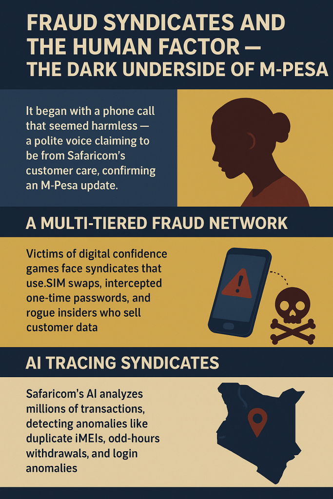 It began with a phone call that seemed harmless — a polite voice claiming to be from Safaricom’s customer care, confirming an M-Pesa update. Within minutes, Jane, a market trader from Nakuru, had lost everything in her wallet: her savings, her chama contributions, her business float. Hers wasn’t an isolated case. Across Kenya, from Kisumu to Kitengela, stories like Jane’s unfold daily — victims of digital confidence games that prey on trust and technological gaps. Beneath the convenience of Kenya’s mobile-money revolution lies a dark economy of cloned SIM cards, intercepted one-time passwords, and rogue insiders who sell customer data. What used to be petty phone scams has evolved into a multi-tiered fraud network, often coordinated through WhatsApp and Telegram groups, blending social engineering with technical precision. By the time victims realize their wallets have been emptied, the syndicates have already moved the money — split it, layered it, and cleaned it across dozens of M-Pesa accounts in seconds.