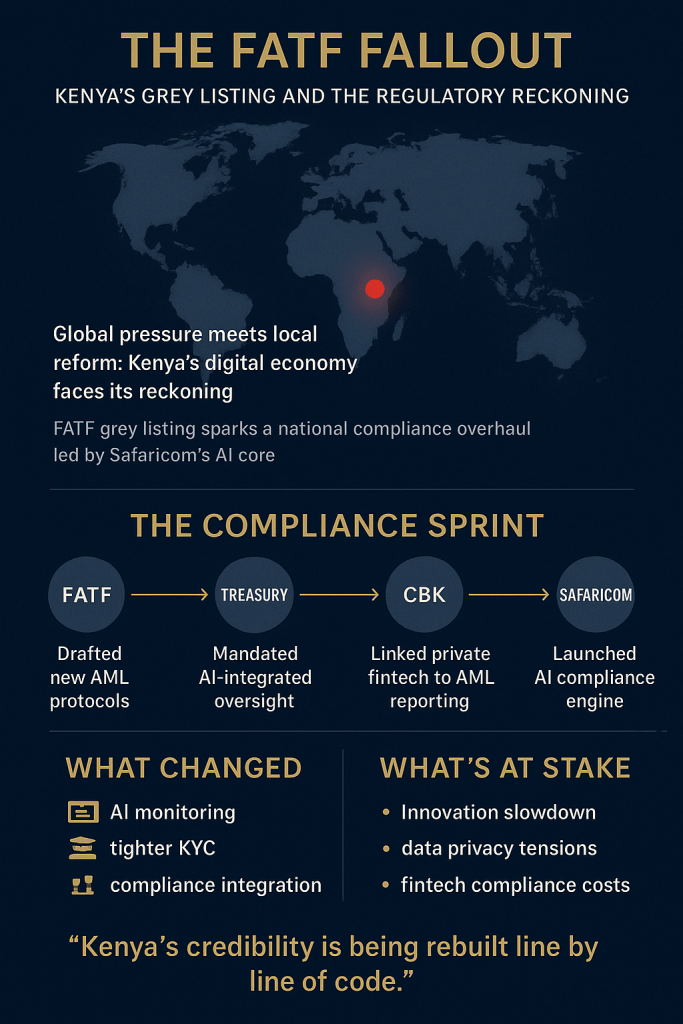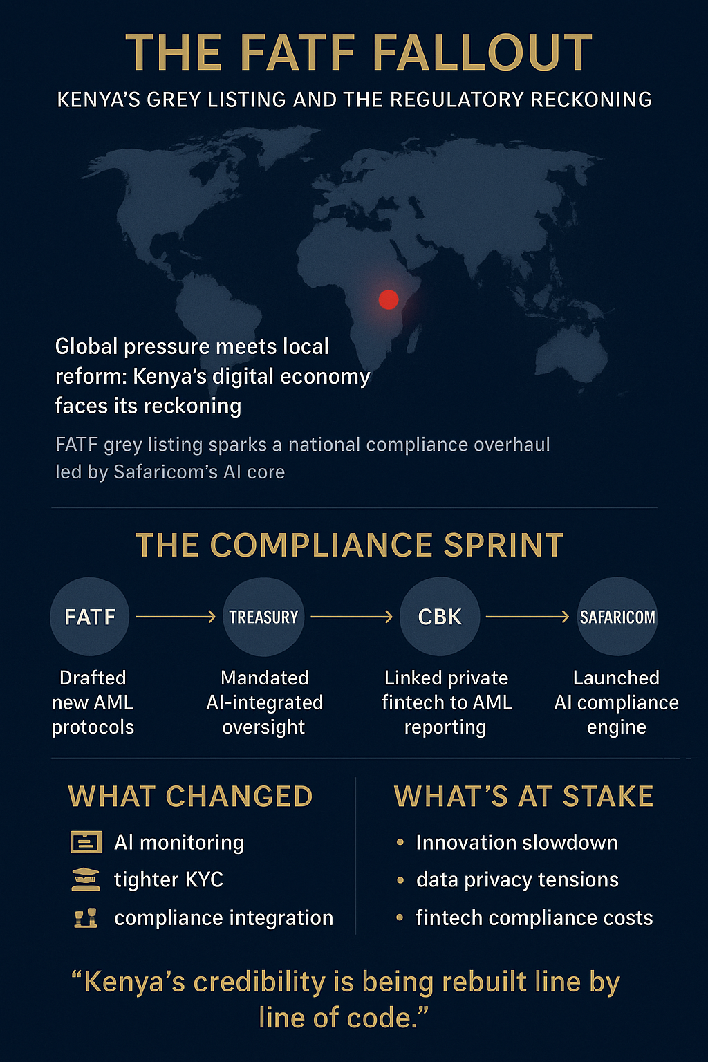 When Safaricom deployed its AI compliance engine, it wasn’t just about technological advancement — it was about survival. Behind the polished rollout was a growing alarm: Kenya had been placed on the Financial Action Task Force’s grey list in February 2024, forcing a reckoning over AML/CFT deficiencies exposed by international watchdogs. The grey listing exposed severe gaps: weak beneficial ownership disclosure, minimal prosecutions of money laundering, and under-regulation of sectors at high risk, including gambling, real estate, non-profit organisations, virtual assets, and law firms. Safaricom, already under pressure, recognized that its standing as the country’s digital financial backbone (through M-Pesa) meant that mere innovation would not suffice without credible compliance. The company’s AI overhaul was not a strategic choice — it was a compliance lifeline in a context where global trust, investor confidence, and even Kenya’s regional financial status were on the line.