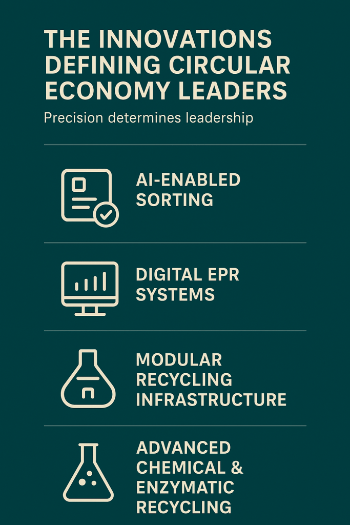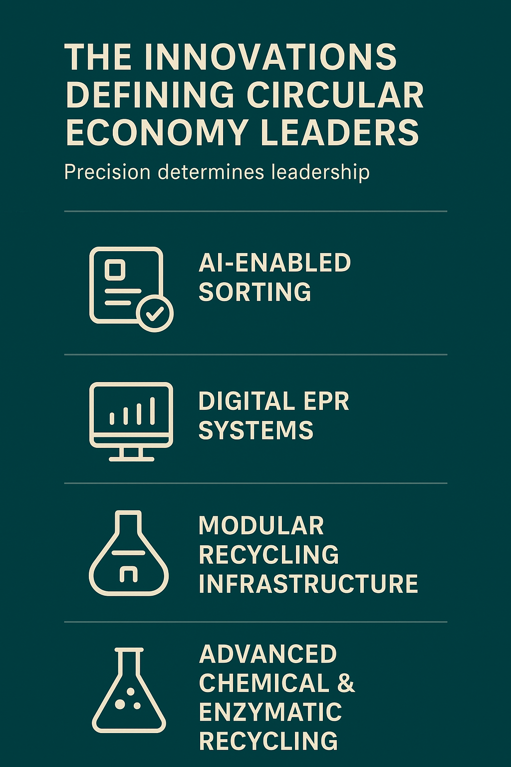 At the center of this separation are four innovation frontiers already reshaping advanced circular systems worldwide. First is AI-enabled sorting, which uses machine vision and spectroscopy to achieve purity levels manual systems cannot sustain, unlocking higher-value rPET and polyolefin streams. Second is digital EPR infrastructure — real-time producer reporting, automated compliance scoring, and public dashboards that eliminate regulatory opacity. Third is modular recycling architecture, where decentralized, scalable MRFs replace monolithic plants that collapse under feedstock volatility. And fourth is advanced chemical recycling, including depolymerization and enzymatic processes that reclaim value from materials mechanical systems cannot process. None of these technologies are experimental. What remains experimental in Africa is the institutional capacity to deploy them without distortion.