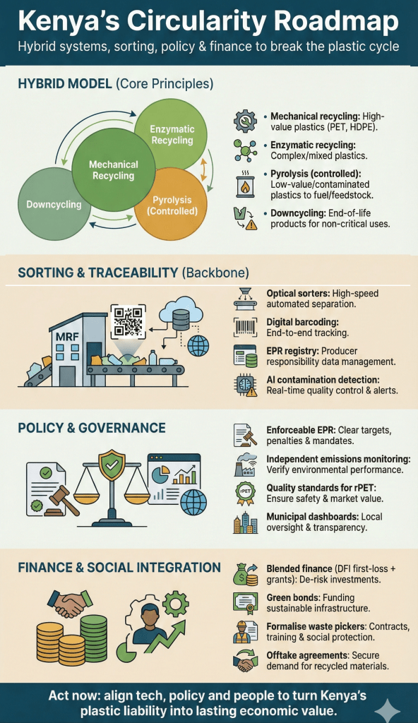 Kenya’s plastic crisis will not be solved by a single breakthrough, a single technology, or a single policy decree. If the past four posts have made anything clear, it is that this challenge is multi-layered — social, economic, technological, institutional — and requires a system far more sophisticated than anything the country has attempted so far. Mechanical recycling alone cannot handle the volume or complexity of the waste stream. Enzymatic recycling promises high-value transformation but depends on disciplined feedstock management and purposeful capital. Pyrolysis offers a pathway for Kenya’s dirtiest plastics, but only if environmental oversight becomes a non-negotiable pillar of implementation. And behind all of it stands the human backbone of Kenya’s recycling economy: the informal waste pickers whose labour determines whether any of these systems succeed or fail. The future Kenya wants — clean cities, competitive green industries, dignified work, and reduced dependence on virgin petrochemicals — will require a hybrid circularity model capable of integrating all these components without allowing any one of them to cannibalize the rest.