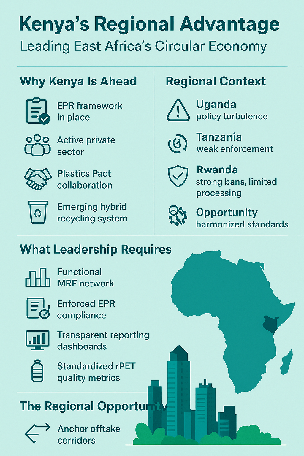 Kenya’s next frontier is to turn its emerging domestic system into a regional value proposition. A country with functional MRFs, enforceable EPR, clear emissions oversight, and a formalized waste workforce can anchor regional offtakes, host cross-border recycling partnerships, and operate as the processing hub for high-quality recycled materials. This is not just about environmental leadership; it is about industrial strategy. Recycled PET, high-grade polyolefins, and monomers from enzymatic recycling are already becoming competitive export commodities. A well-structured Kenya can supply the region, attract capital, and negotiate stronger procurement terms with global brands seeking compliant supply chains. The opportunity is enormous — but it depends entirely on Kenya proving, through action rather than rhetoric, that it can run a transparent, disciplined, and investable circular system. If Kenya consolidates its internal framework now, it can shape East Africa’s circular economy for a generation. If it delays, the window closes — and leadership moves elsewhere.